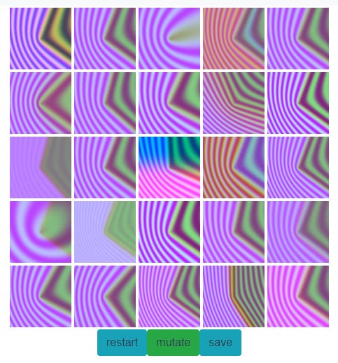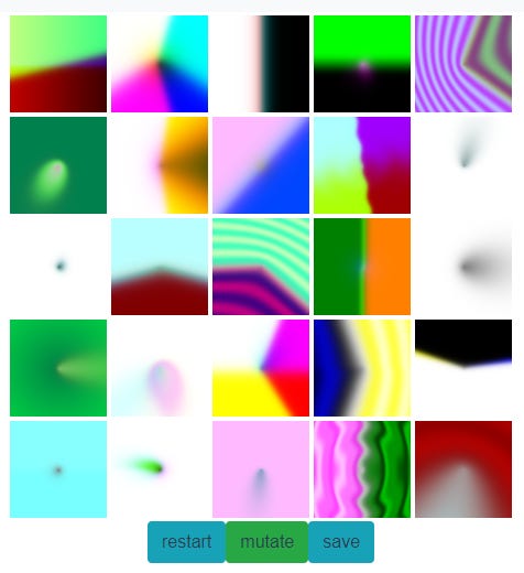 There’s a really good example of this concept from the world of Artificial Intelligence. Picbreeder was a project started by the researcher Ken Stanley. You can try it yourself here. First you will be presented with a set of random pictures. You can select one that’s “interesting” to you and click “mutate.”