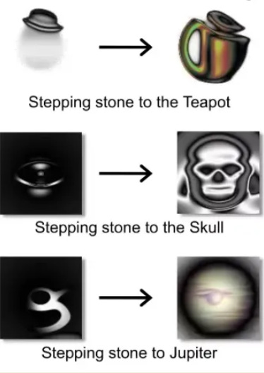 But Stanley also discovered that the “stepping stones” to recognizable pictures almost never resembled the final outcome. If users tried to deliberately “breed” a butterfly or skull in advance, they simply couldn’t do it.