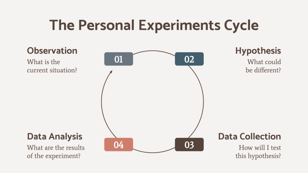 One simple introductory model is her personal experiments cycle. First you ask a question around something you're curious about, then you formulate a hypothesis, then you then run an experiment that allows you to test that hypothesis. The results of that experiment will produce more questions that form the basis of your next experiment. Often that means committing in advance to a number of repetitions: for example she committed to writing a newsletter every day for 100 days (she now has over 50,000 subscribers).