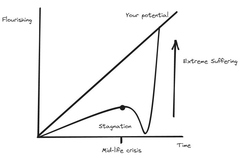 When properly understood, the perception of midlife transitions can morph from a shameful and lonely crisis to a difficult necessary, evolution of your personality. If the self-reported wellbeing trough doesn't start improving until retirement, this so-called “crisis” is actually an opportunity to flourish far earlier in your life.