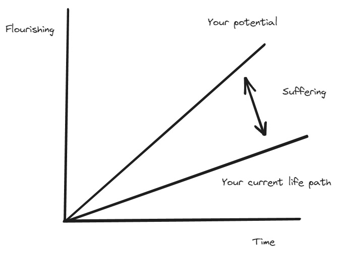 I frequently encounter people in various degrees of distress caused by being stuck or lost, mostly professionally. I offer them all a profoundly optimistic insight. I believe your present suffering is directly proportional to your future potential. I can’t see how it could be any other way. If you had no latent potential, and were content to be stuck in a mediocre life, there would be no psychological pain. One of my favourite quotes comes from Brené Brown in the best article I've ever read on midlife transitions3: "your armor is preventing you from growing into your gifts."