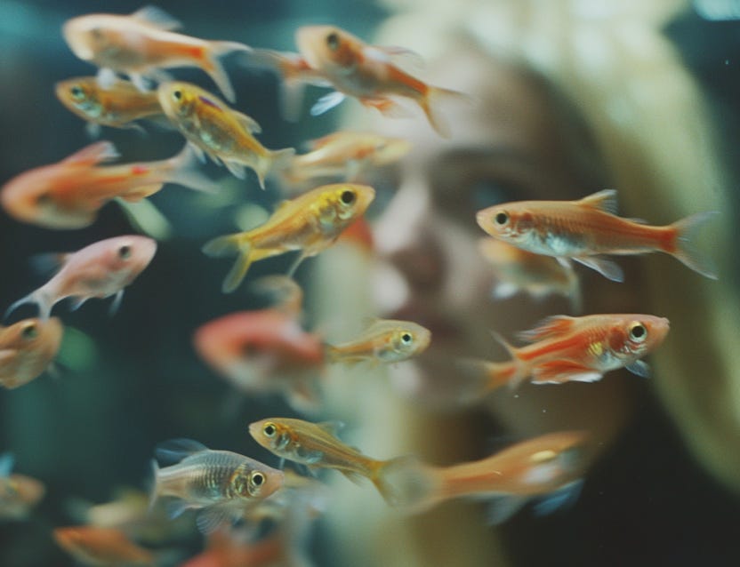 Every morning before work, Claire walks past the tank and sprinkles some fish flakes in the water. If the fish could muster a small degree of environmental awareness, what would they make of Claire? Would they understand her motivations? What T.V. shows she likes? Who her friends are? Or would they simply see a dark blob dropping food in the water?