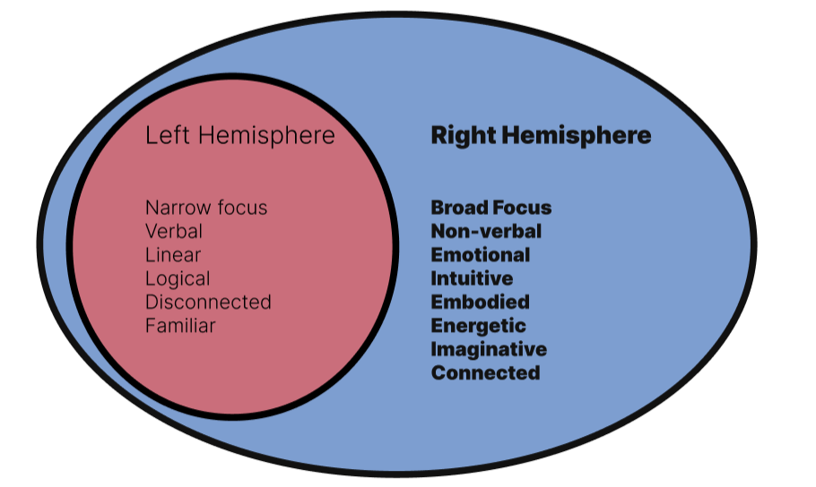 The definition of wisdom I like the most is: “doing exactly the right thing at the right time.” Often this means rebalancing towards our brain’s holistic right hemisphere so it can help direct our left hemispheric attention and agency. In short: our right hemisphere is better at telling us what to do, and when. This means amplifying the characteristics of the right hemisphere, below.