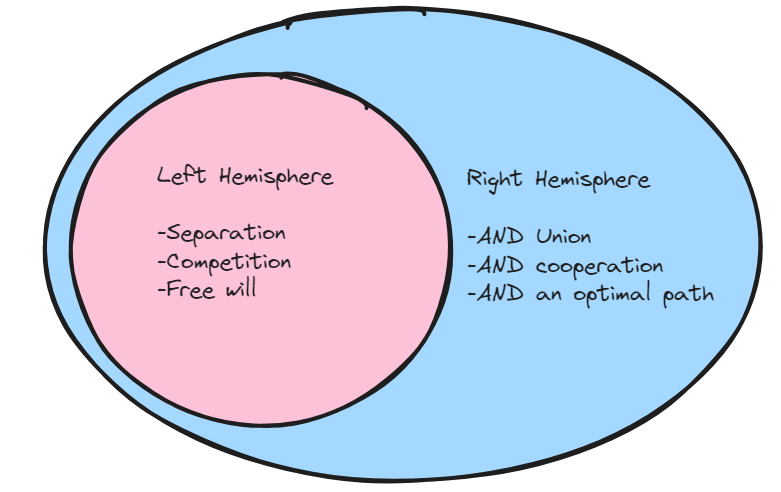 This observation from McGilchrist also blew me away: “If you experimentally suppress the left hemisphere for, say, 10 or 15 minutes, people describe things that they would normally consider inanimate as animate. So they see the sun as animate, moving across the sky and giving energy. And if you do the opposite and suppress the right hemisphere, they see things that we would normally think of as living as not. So people are like bits of furniture, like zombies, or simply machines.”