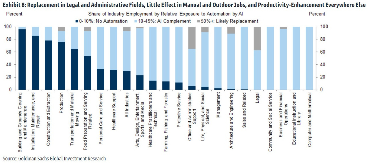 It’s dangerous to forecast technological unemployment, but the current paradigm shift in A.I. has made it uncertain which virtual jobs will be made obsolete right now. A recent Goldman Sachs paper reached the obvious conclusion that digital jobs are being disrupted first, with minimal effect on manual & outdoor.