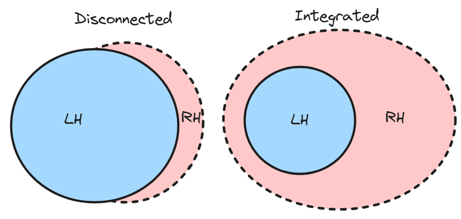This is where McGilchrist’s hemisphere theory is most useful. The one word I would use to describe our left hemisphere is disconnected. The left currently dominates Western society and our overly-intellectual elites. The verbal and logical left can drown out the subtle and non-verbal right. And yet the emotional and somatic right is more connected to the integrated, intelligent attractor. The left is competitive with the right, but the right is cooperative with the left. The left lies when it doesn’t understand something, the right is totally truthful. The right needs to integrate the left.