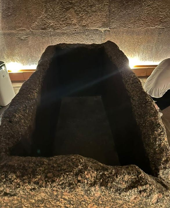 I lay in absolute darkness, while we matched our voices to the resonance of the room. The whole Chamber was throbbing. It was eerie, otherworldly and beautiful. I hummed until I found the frequency of the granite around me, which was easy to do. My whole head and torso started immediately vibrating in sympathy. The sarcophagus resonates at ~117 Hz, a low-frequency sound that apparently enhances interoceptive awareness, which helps you feel more connected to your body.