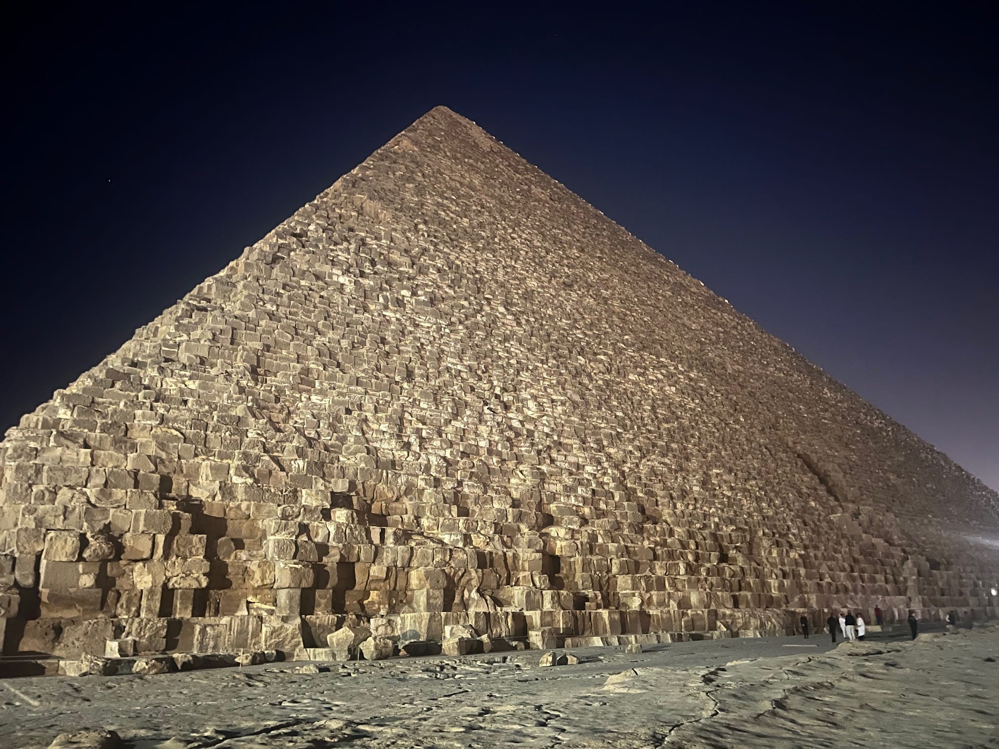 There was a red moon rising over Cairo by the time we arrived outside the entrance to the Great Pyramid of Khufu. The plateau was totally deserted, except for a few stray dogs. Along with our guide, our small group of seven walked up a short flight of jagged steps towards a grotto-like hole in the side of the pyramid.