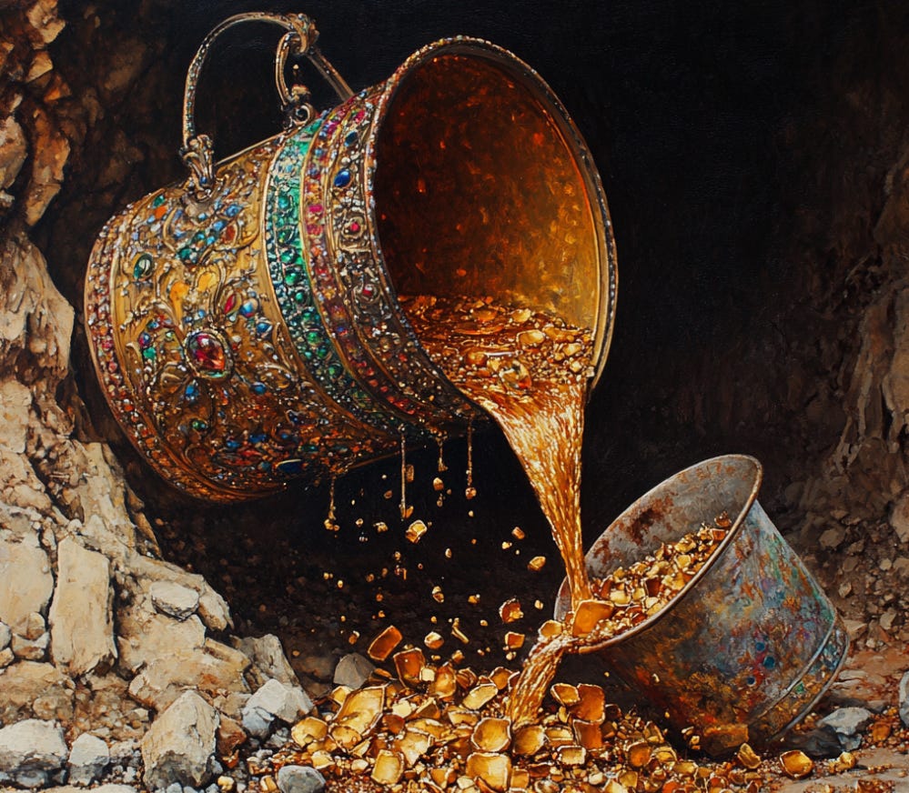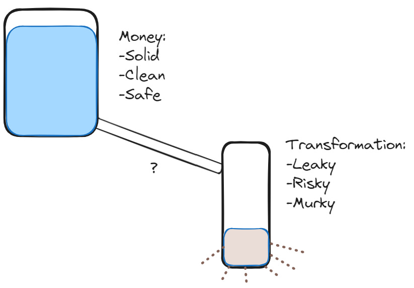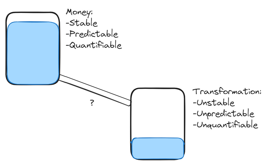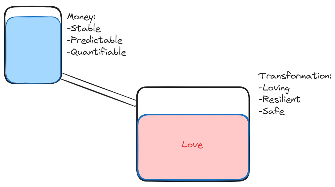 So why is money so allergic to the personal transformation industry? The problem is that the righthand container is often leaky. The value provided by transformational practices and practitioners can be unreliable and vague. Even the word spirituality itself can be fuzzy and alienating. How do I know if breathwork or somatic meditation or Internal Family Systems is right for me? What does it mean if it “works”? The water is often murky too: is the practitioner well-trained, ethical, or riddled with their own shadows and complexes? How would I know? If I pour my hard-earned crystalline waters of wealth into that murky, leaky container will it simply trickle away tainted? No, it’s better to play it safe in case that rainy day comes.